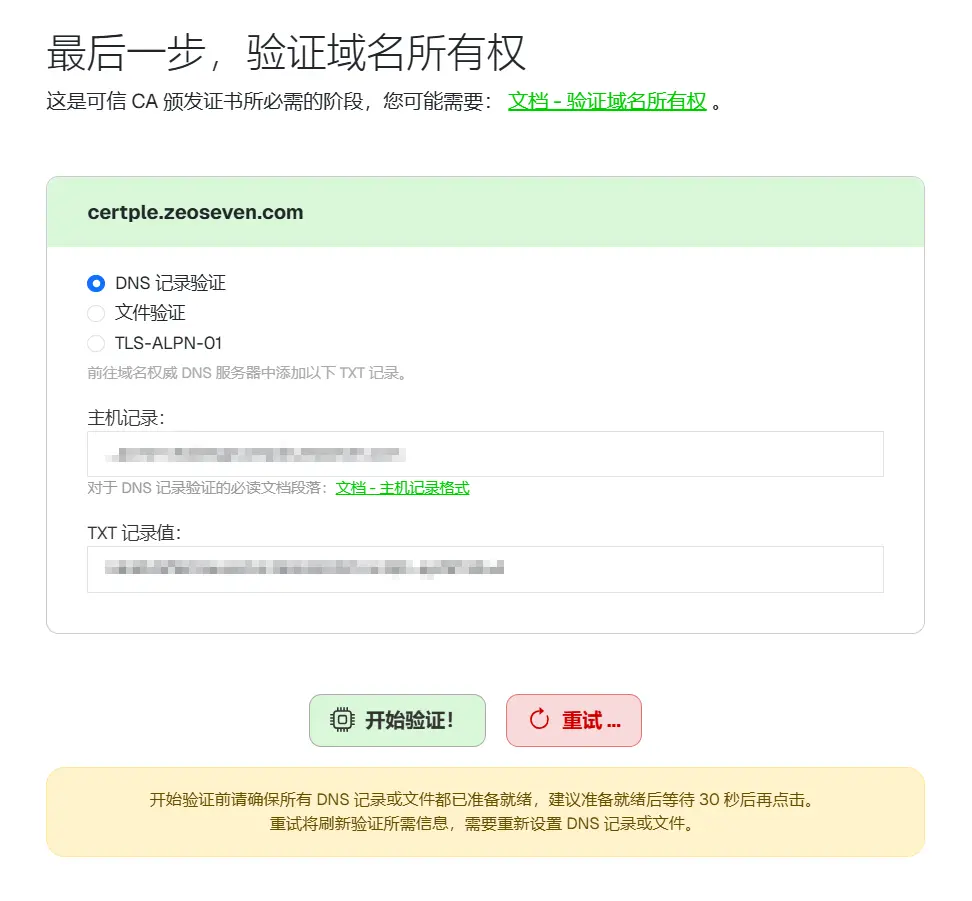 建议在添加全部 TXT 记录后,不要急于点击开始验证按钮,等待 30 秒左右再点击,以缓解 DNS 传播的延迟。否则如果至多一个记录验证失败,则验证不通过,需要重新添加新的记录值。
